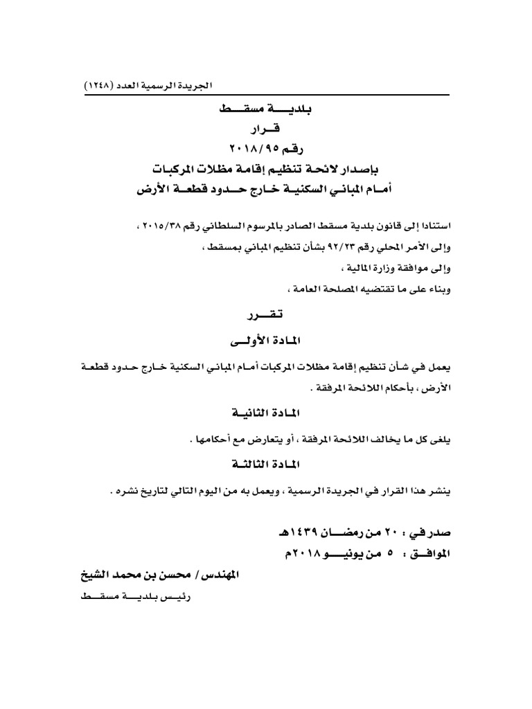 قرار بإصـدار لائحـة تنظيـم إقامـة مظـلات المركبـات أمـــام المبانــي السكنيــة خــارج حــــدود قطعـــة الأرض